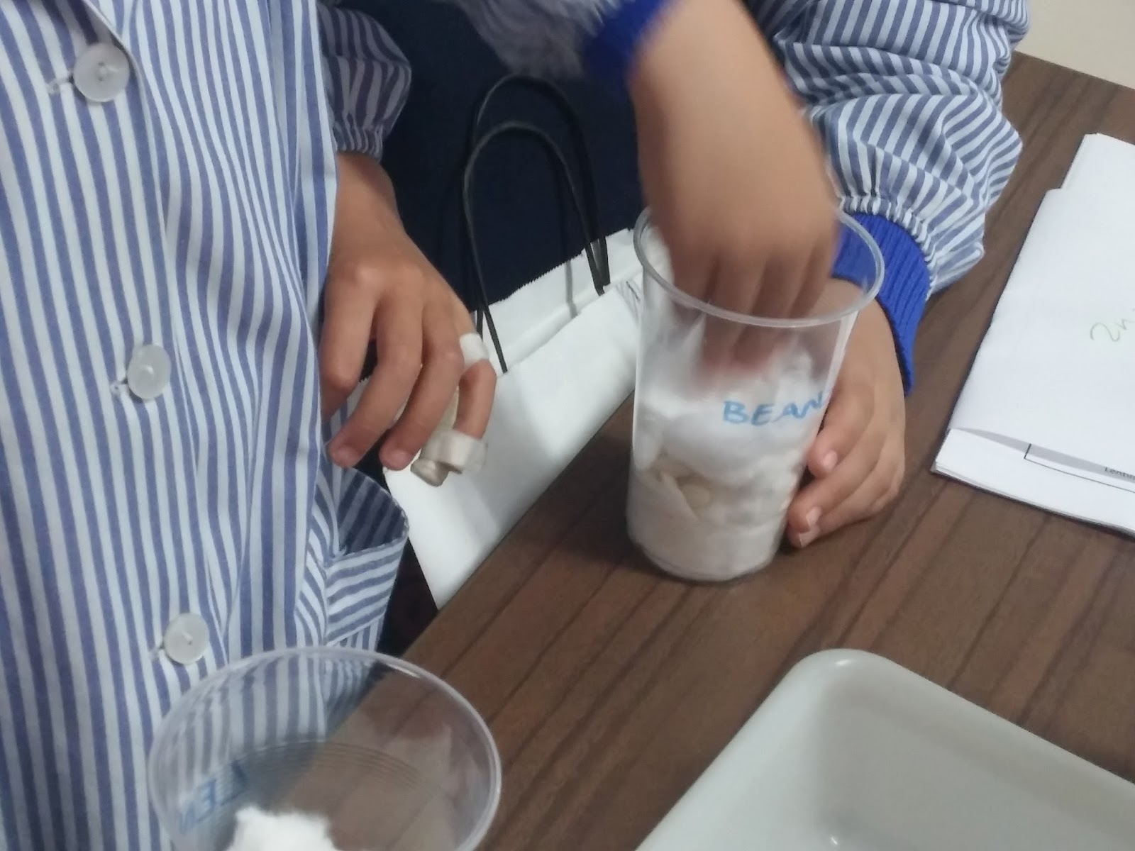They put some cotton inside the plastic cups, then the lentils and beans seeds and finally more cotton on the seeds. After this process, they watered the plants and we put them in the balcony of the classroom so this weekend the plants will have light, air and sun.
